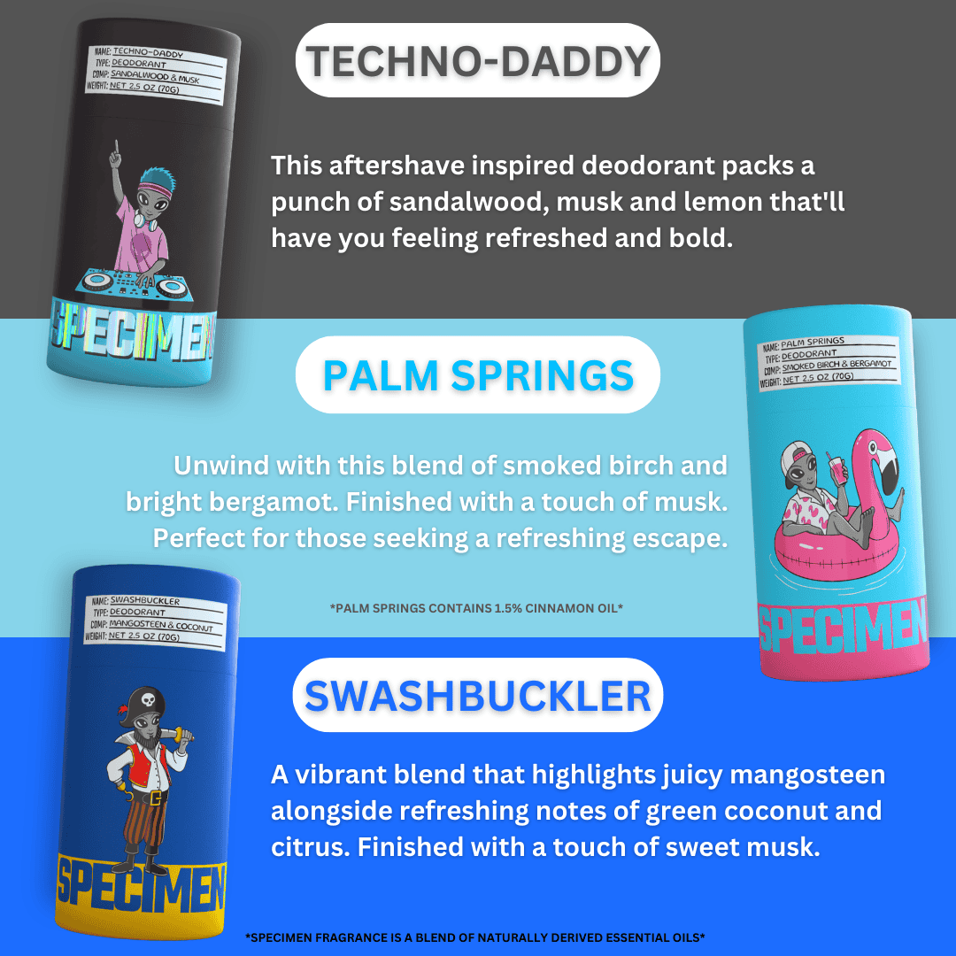 This pack includes three distinct scents: Swashbuckler (Mangosteen & Coconut), Techno-Daddy (Sandalwood & Musk), and Palm Springs (Smoked Birch & Bergamot).