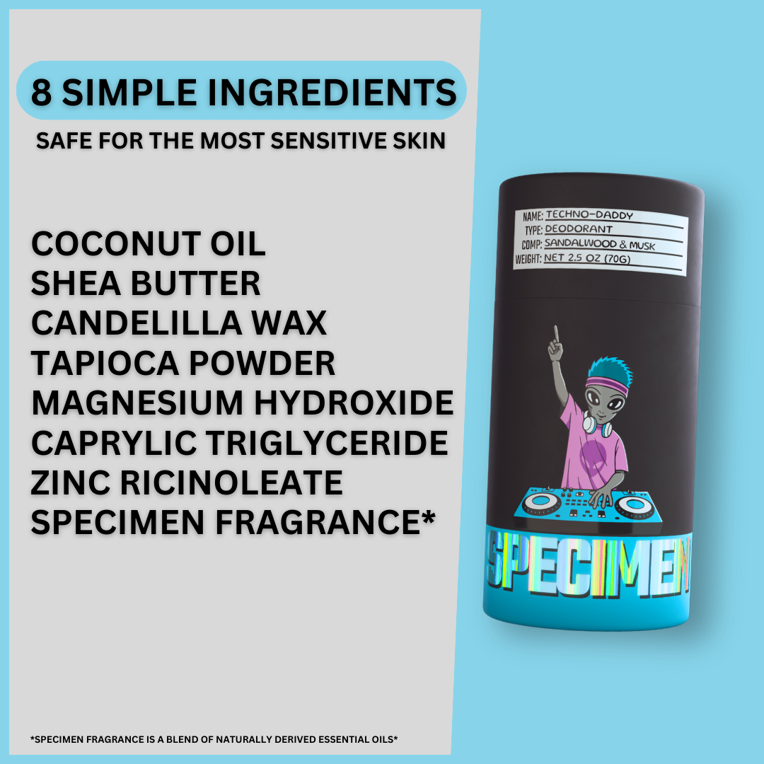 Coconut Oil, Shea Butter, Candelilla Wax, Tapioca Powder, Magnesium Hydroxide, Caprylic Triglyceride, Zinc Ricinoleate, Specimen Fragrance *See FAQ's for allergy info*